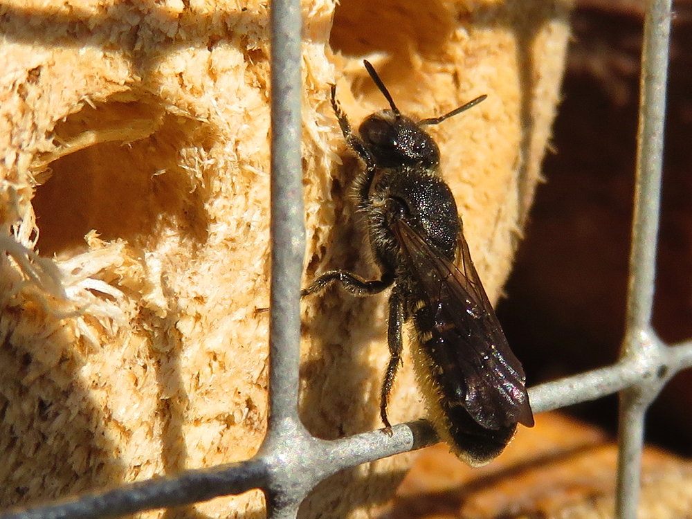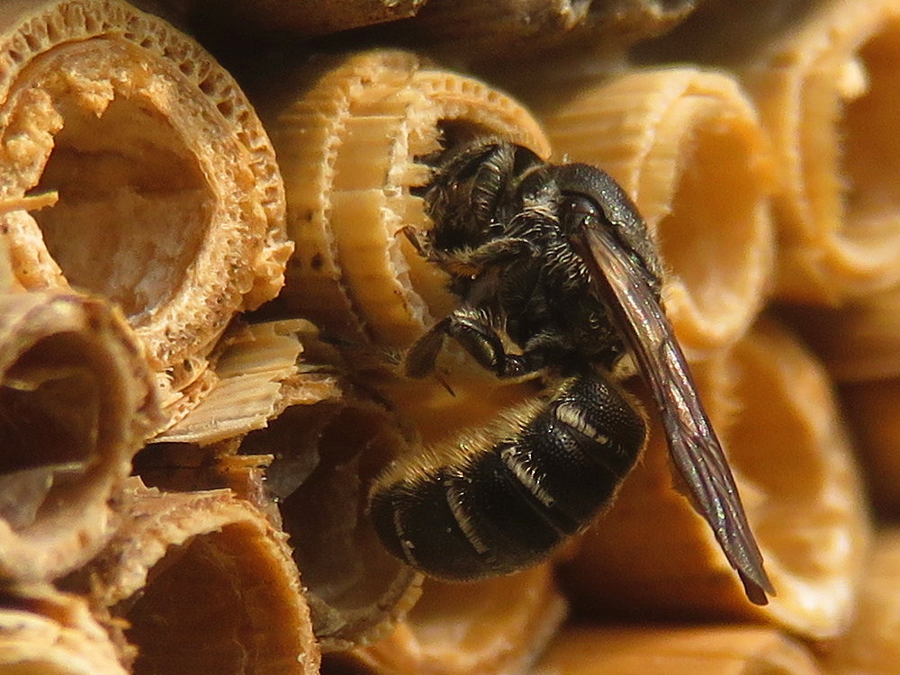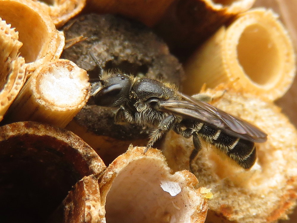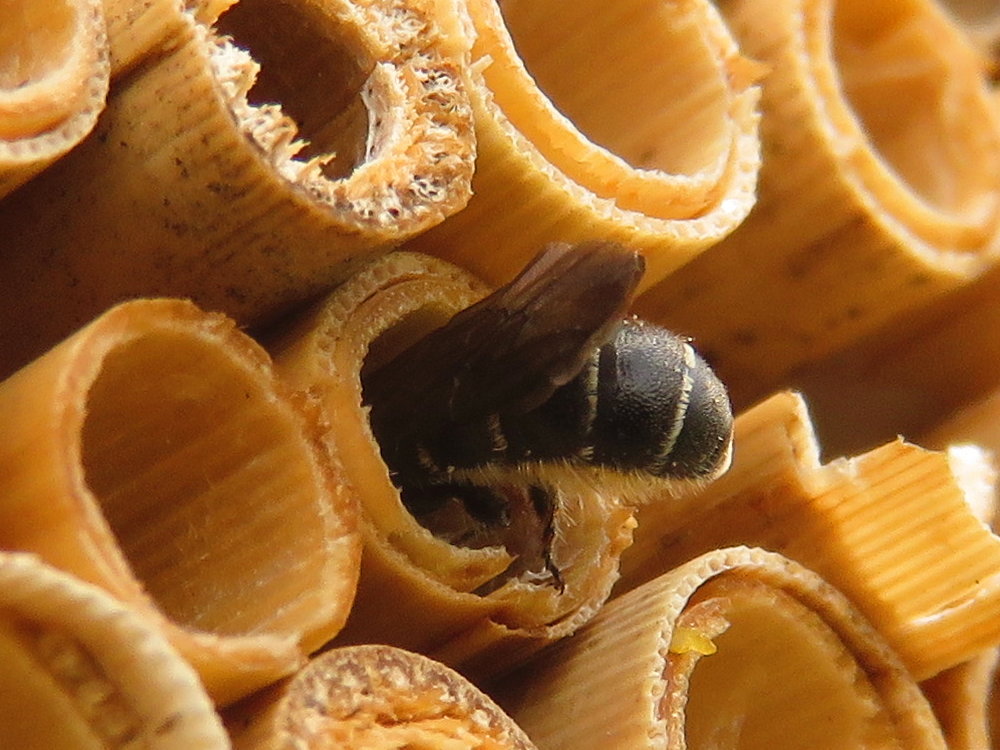 De Grote klokjesbij maakt dankbaar gebruik van het insectenhotel in onze tuin. Hieronder is de bij te zien terwijl ze bezig is met het bouwen van een nest. De nestgangen worden afgesloten met leem en zand dat wordt vermengd met kleine steentjes. Onder andere de hongerwesp Gasteruption erythrostomum parasiteert de nesten van de Grote klokjesbij.