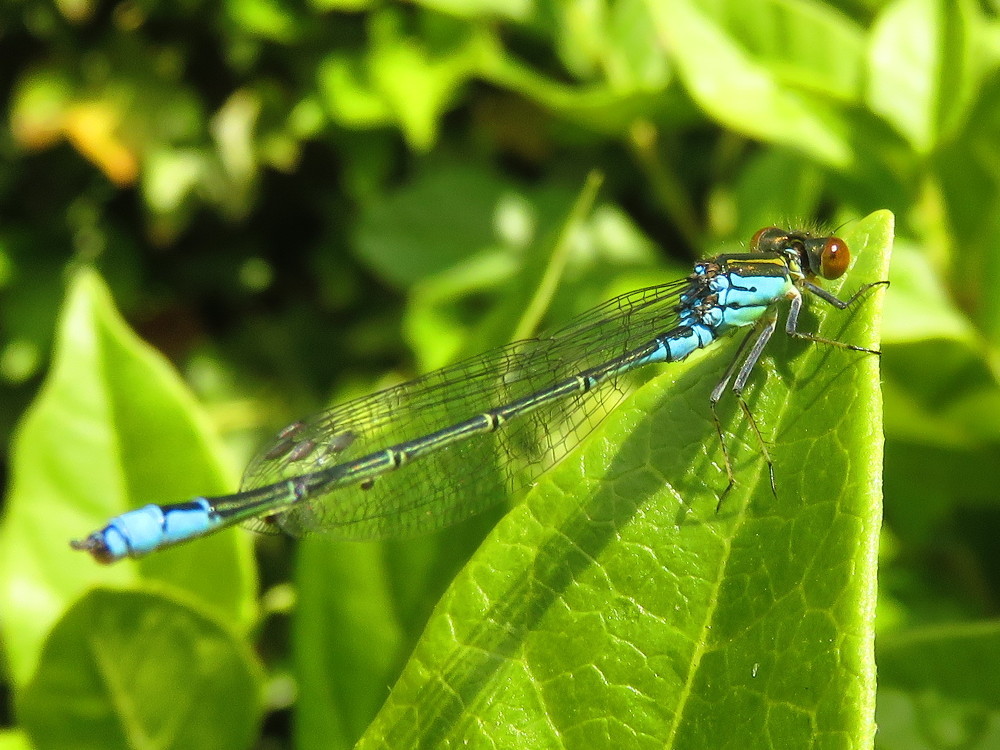 (bij de Grote roodoogjuffer is segment 8 helemaal zwart) - segment 9 en 10: volledig blauw met op segment 10 een zwarte x-vormige figuur