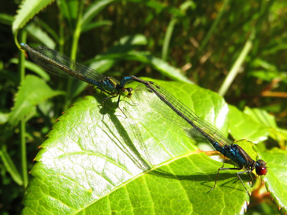 De Kleine roodoogjuffer (Erythromma viridulum) is een relatief kleine juffer waarbij de mannetjes te herkennen aan de rode ogen. De ogen van de vrouwtjes zijn bruin met groen of geel. De juffer is overal in Nederland te vinden in stilstaand of langzaam stromend water met drijvende waterplanten. Hieronder zie je het mannetje en vrouwtje bij elkaar.