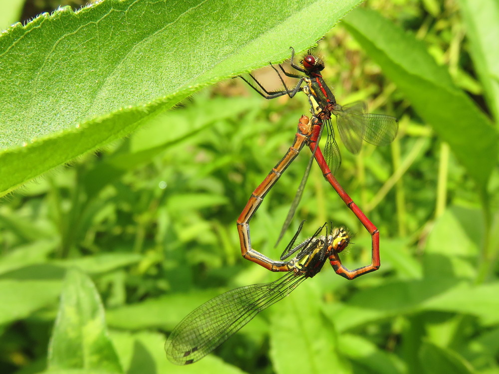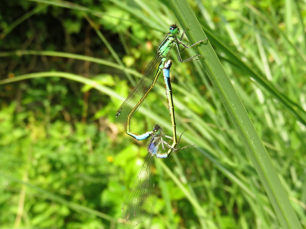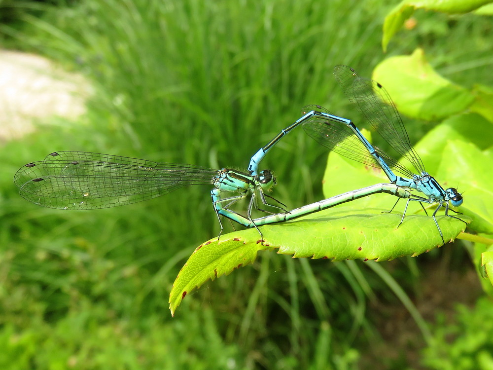 Het was vandaag een vruchtbare dag voor de waterjuffers in onze tuin. De Azuurwaterjuffers, de Vuurjuffers en de Lantaarntjes vonden een partner en vormden een paringswiel om zich voort te planten. De mannetjes houden de vrouwtjes bij de paring vast met een soort tang aan het achterlijf. De vrouwtjes brengen dan de punt van het achterlijf naar de eerste achterlijfsleden van het mannetje. Zo vormen ze samen een mooie hartvormige figuur, het paringswiel. Als de paring lukt en het vrouwtje is bevrucht worden er direct daarna eitjes in het water afgezet.