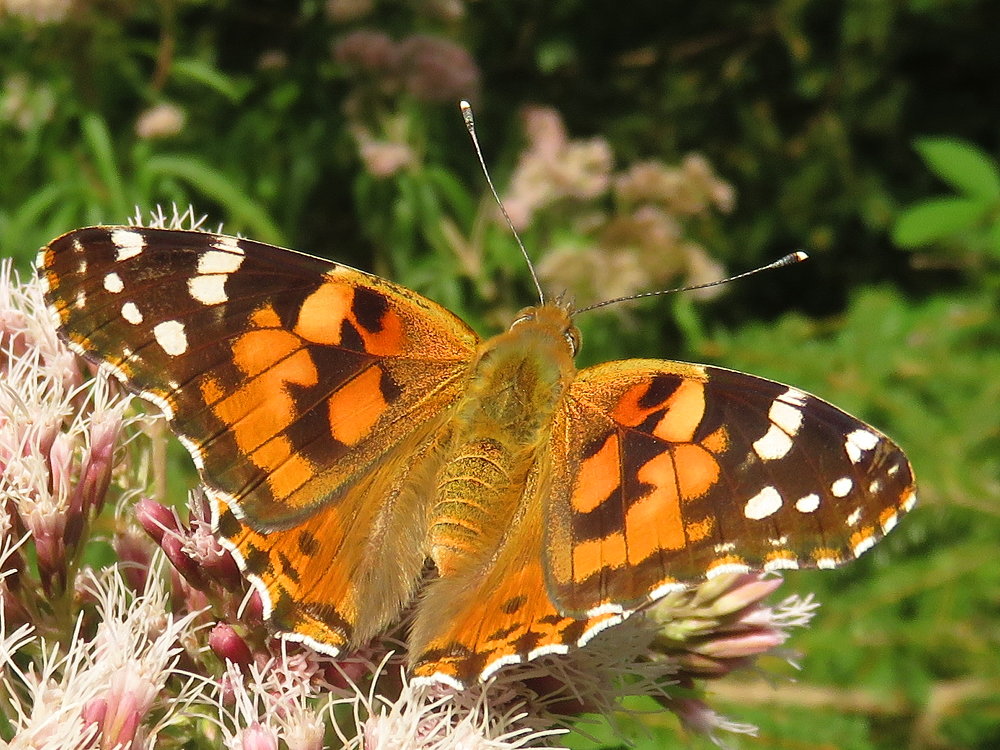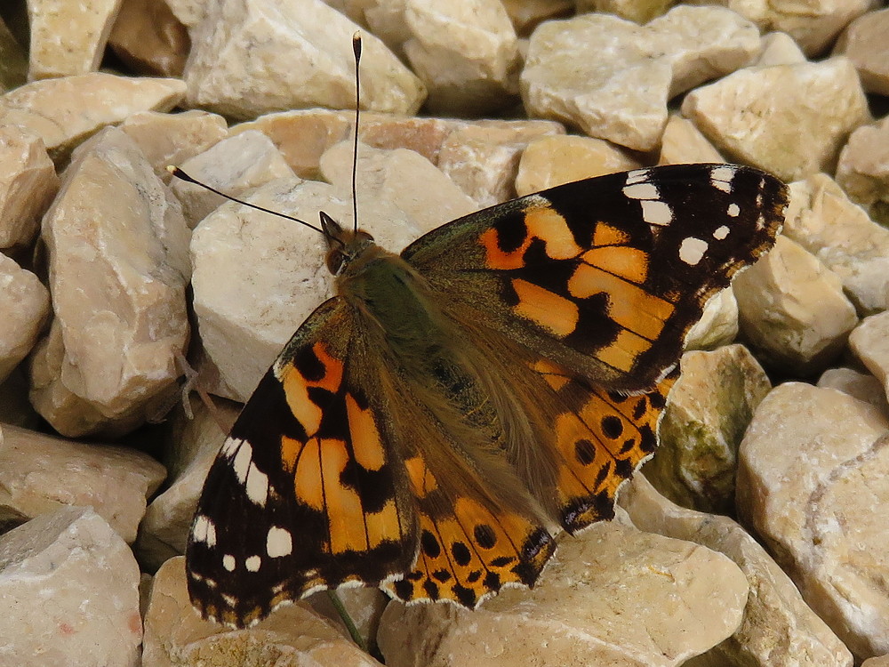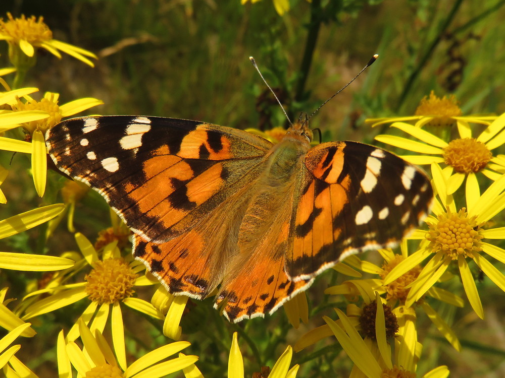 De Distelvlinder (Vanessa cardui) is een grote oranje vlinder met zwarte vleugelpunten en witte vlekken. Het is een trekvlinder, die vanuit Afrika en Zuid-Europa naar Nederland vliegt. In sommige jaren zijn dat er heel veel en in andere jaren zie je ze veel minder. Je kunt de vlinder overal in Nederland tegenkomen.