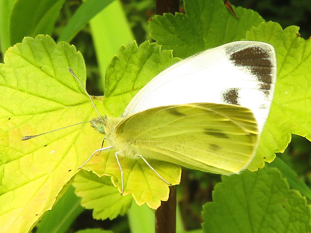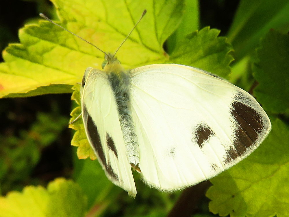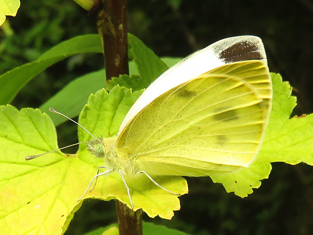Bij dit mannetje loopt de zwarte vleugelvlek zover door dat het bijna een Groot koolwitje lijkt. Maar in combinatie met de vorm van de middenvlek en de rondere vleugelpunt is het toch herkenbaar als Scheefbloemwitje.